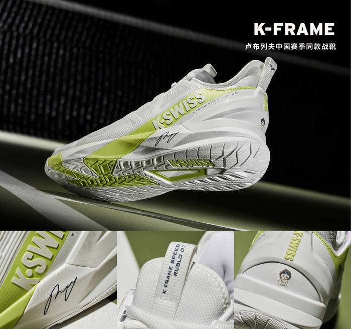 K-FRAME SPEED RUBLO卢布中国赛季限量配色则是采用了白色与酸性绿的清新设计,环绕鞋身的酸性绿条纹,打破视觉的平衡感,RUBLO Logo、卢布列夫签名以及卢布猫元素的加入,让每一次蹬转和跑动都极具观赏性。